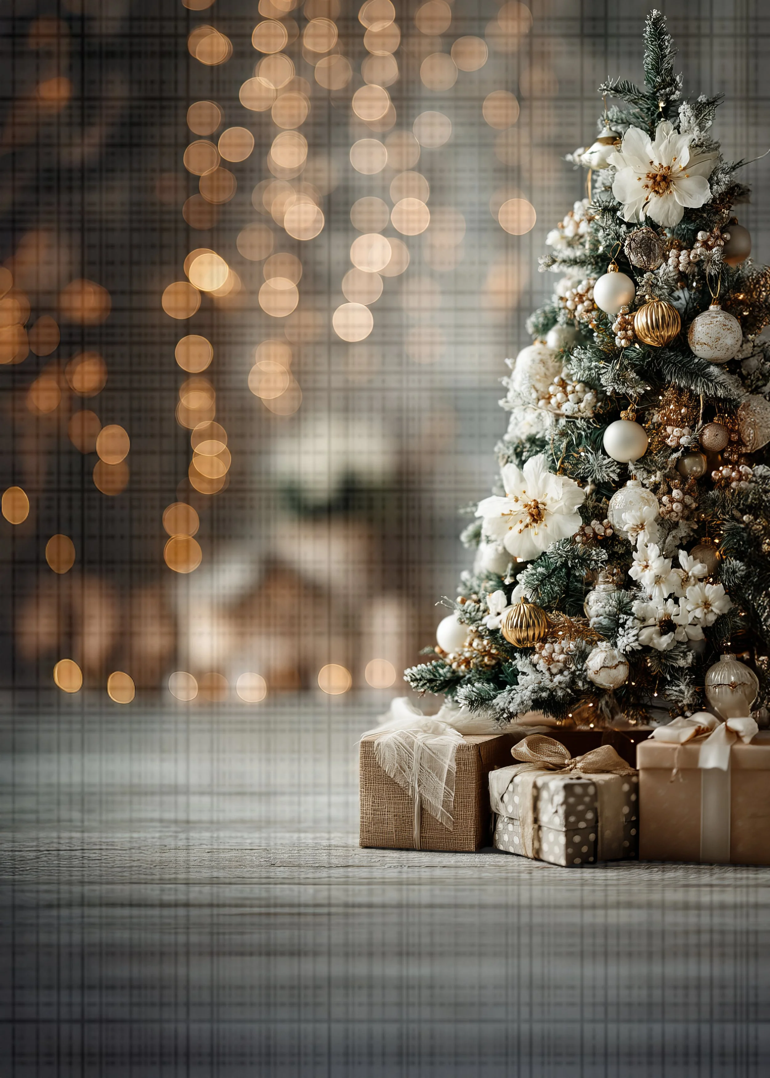 Create magical holiday portraits with this Golden Glow Christmas tree backdrop. With shimmering gold ornaments, glowing fairy lights, and elegant white florals, it’s perfect for timeless Christmas photos.