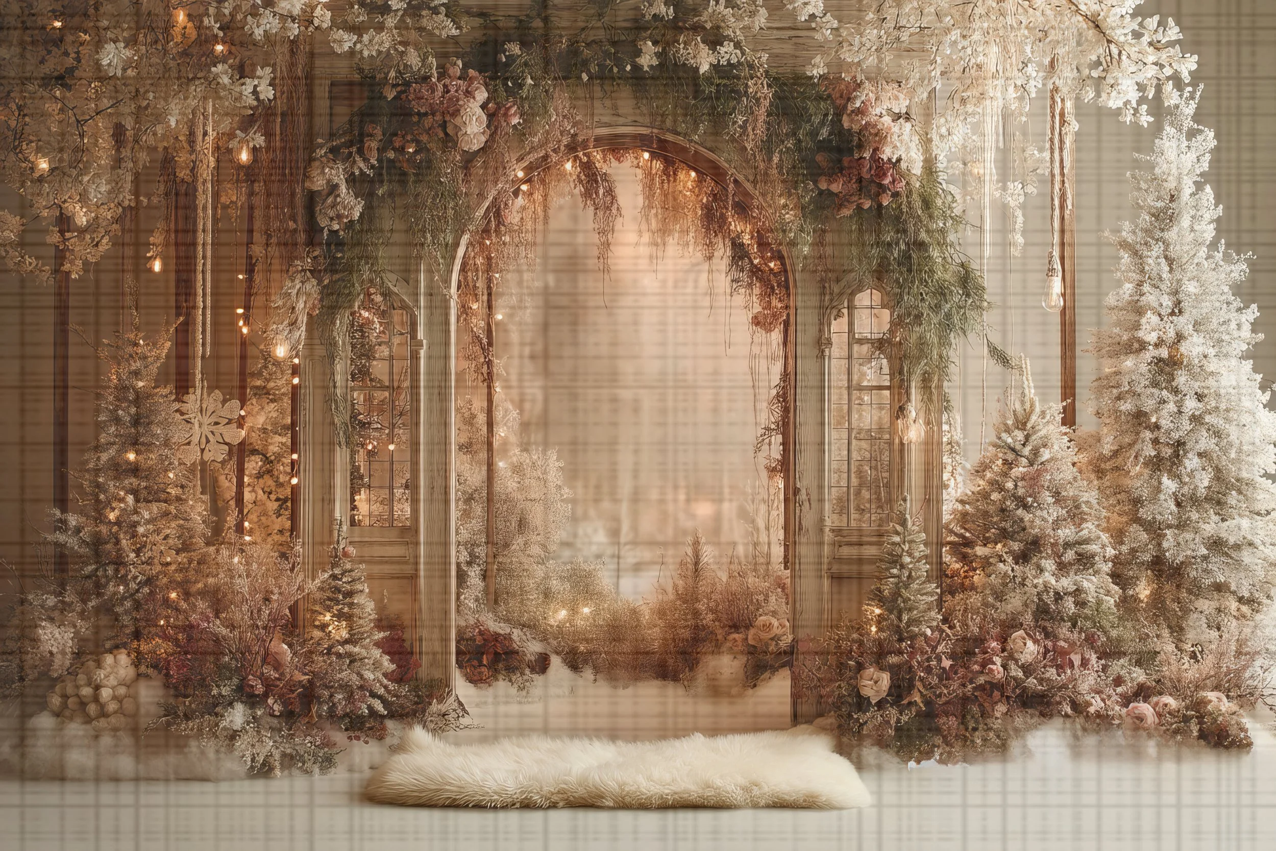 A fairytale-style Christmas backdrop featuring a rustic arch draped in frosted greenery, warm fairy lights, and elegant floral accents. With snowy trees framing the scene, it creates a magical holiday portrait setting.